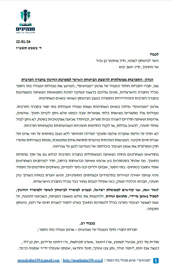 מכתב דחוף לשר לביטחון לאומי ולשר החינוך על רקע ההידרדרות החמורה בביטחון האישי בחברה הערבית כולה, אשר פוגעת גם במערכת החינוך.